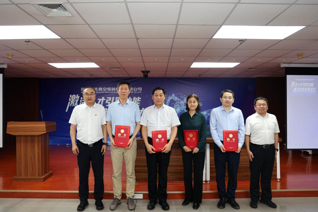 寶光股份紀(jì)委書記姚書勤,副總經(jīng)理袁軍為分別宣讀了高層次科技創(chuàng)新人才和重大創(chuàng)新團(tuán)隊(duì)名單。謝洪濤為元復(fù)興、劉志遠(yuǎn)、顏莉萍、馬慧4名外部專家頒發(fā)了聘書,組織簽訂了內(nèi)外部師帶徒協(xié)議。向高層次科技創(chuàng)新人才頒發(fā)了聘書,并與重大創(chuàng)新團(tuán)隊(duì)負(fù)責(zé)人簽訂了定向支持承諾書,首批選取了變壓器有載分接開(kāi)關(guān)真空滅弧室研發(fā)、252kV單斷口真空滅弧室研發(fā)、高電壓真空滅弧室研發(fā)、高可靠彈性元件研究四個(gè)項(xiàng)目做為重大創(chuàng)新項(xiàng)目進(jìn)行專項(xiàng)激勵(lì),與項(xiàng)目帶頭人簽訂了激勵(lì)任務(wù)書。外部專家的加入不僅為企業(yè)提供了強(qiáng)有力的智力支持,更能通過(guò)指導(dǎo)和交流激發(fā)企業(yè)內(nèi)在技術(shù)研發(fā)創(chuàng)新動(dòng)力,這為高層次科技創(chuàng)新人才培養(yǎng)和重大創(chuàng)新團(tuán)隊(duì)后期工作開(kāi)展提供了方向引領(lǐng)和堅(jiān)實(shí)技術(shù)支持保障。