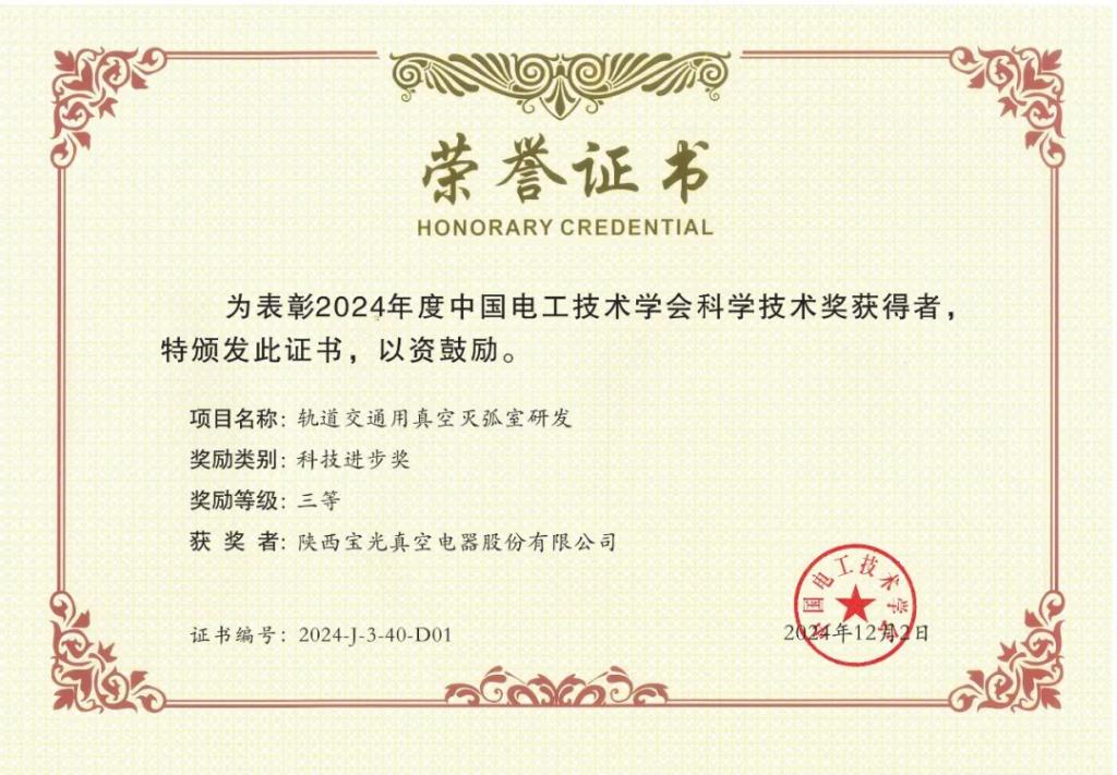 近日,2024年度中國電工技術(shù)學(xué)會科學(xué)技術(shù)獎獲獎項目正式公布,中國電工技術(shù)學(xué)會對155項獲獎項目(其中特等獎2項、一等獎31項、二等獎50項、三等獎72項)和20位青年科技獎獲獎人進(jìn)行了公布和表彰。寶光股份獲各類獎項共計2項,參與科技進(jìn)步獎二等獎1項!獲得科技進(jìn)步獎三等獎1項!項目名稱:大容量換流變壓器用有載分接開關(guān)國產(chǎn)化關(guān)鍵技術(shù)及工程應(yīng)用。相關(guān)產(chǎn)品簡介:本項目使用了換流變壓器有載分接開關(guān)用TFJ221型真空滅弧室,作...